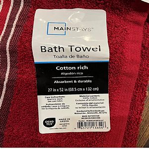 RED BATH TOWELS BY "MAINSTAYS"27" X 52" 100% COTTON ABSORBENT & DURABLE UPC 665721136546 6 PER CS - 500 CS 6 PALLETS  QUANTITY:3,000 TOWELS CLOSEOUT COST: $5.00 EA  Email id:Hajisalim@globalplayersintl.com +91 9819246785/Whatsapp Take All FOB USA NYC