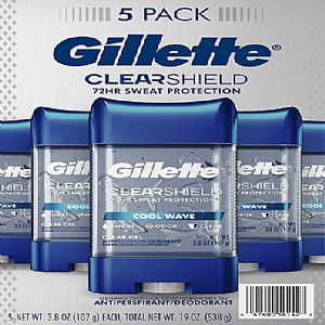 GILLETTE CLEARSHIELD GEL 3.8oz CLUB PACK GILLETTE ANTI-PERSPIRANT / DEODORANT CLEARSHIELD CLEAR GEL COOL WAVE 5PK ; 3.8oz Exp Date: JAN 2027 5 Pack UPC: 0-47400-56142-7 UNIT UPC: 0-47400-09772-8 360 Packs Per Pallet MOQ: 5 Pallets Unit Price:$5.50ea Email id:Hajisalim@globalplayersintl.com +91 9819246785/Whatsapp Take All FOB USA NYC