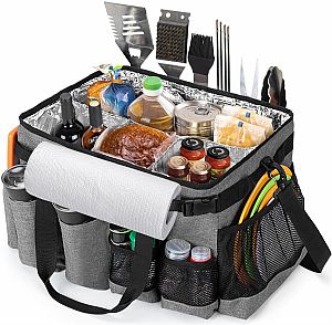 Mobile Food Prep - BBQ Grill Caddy A Must-Have for Emergencies as Well Easy-to-clean aluminum-lined interior with dividers and mesh pockets Exterior pockets and loops for condiments, plates, and grill tools Three carrying options: shoulder strap, long padded handles, side handles Folds flat for compact storage Ideal for picnics, camping, tailgates, and family cookouts The BBQ Grill Caddy is a compact convenient organizer for outdoor gatherings. keeps all your essentials neatly in one place and is easy to carry and store. perfect caddy to have during bad weather READY NOW - Reserve Your Stock Today Item:GRL75-1495 Quantity: 1950 units Price: $ 39.90ea Email id:Hajisalim@globalplayersintl.com +91 9819246785/Whatsapp Take All FOB USA NYC